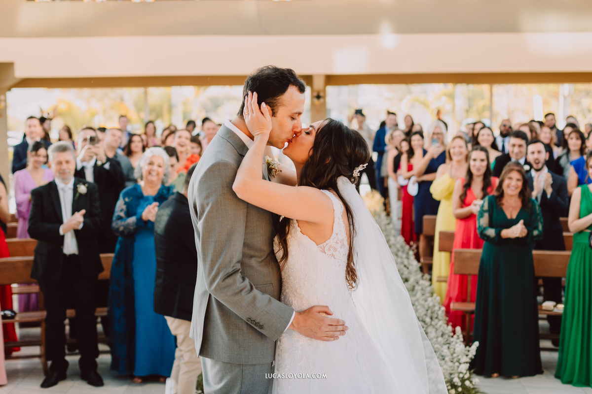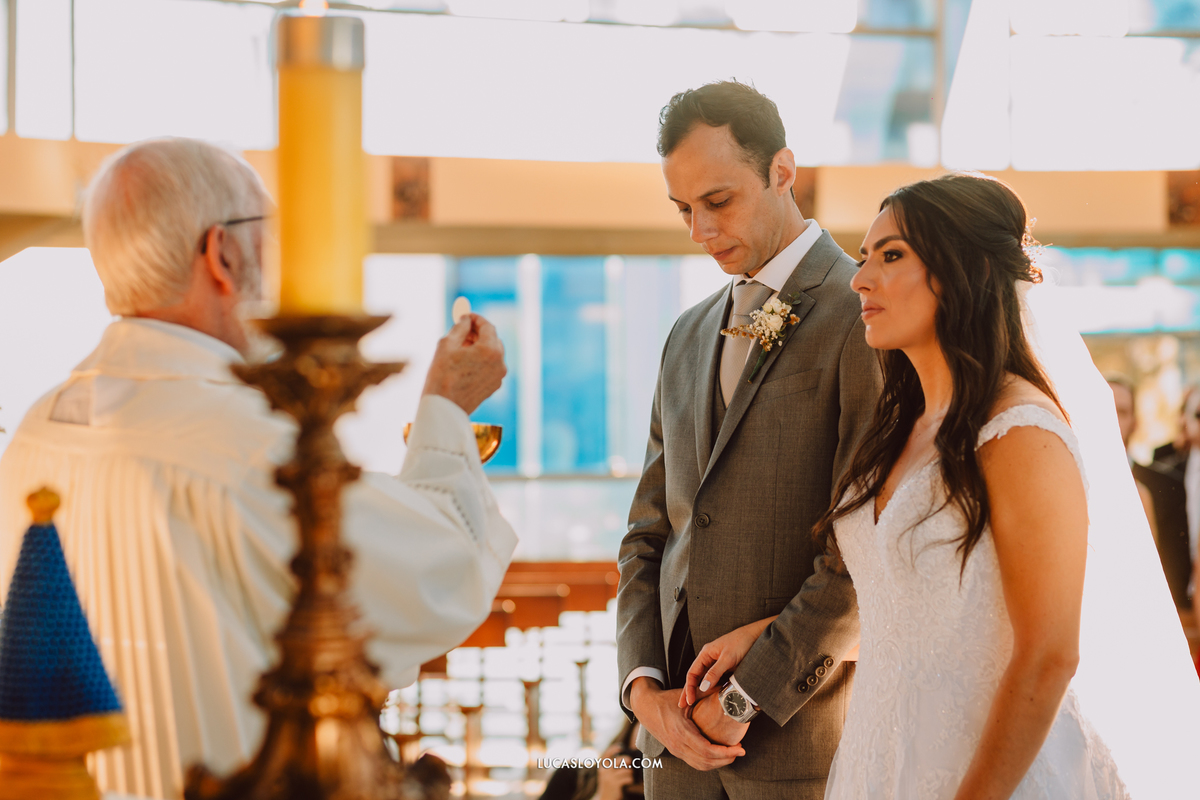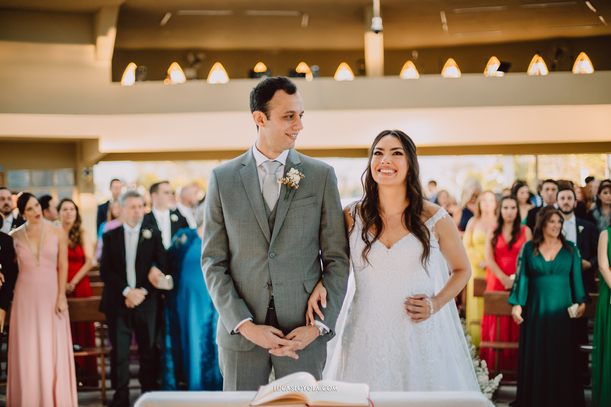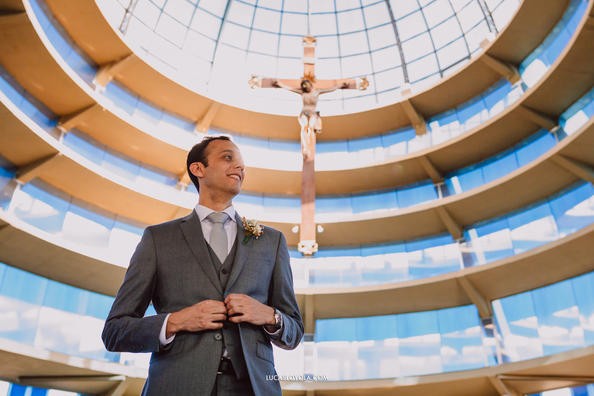 O estilo escolhido pelo casal foi clássico, com um toque de elegância que combina perfeitamente com eles. Mas aqui está o detalhe especial que fez esse casamento único: a cerimônia aconteceu em uma igreja redonda, toda cercada de vidros. A luz do dia criou uma atmosfera mágica.
