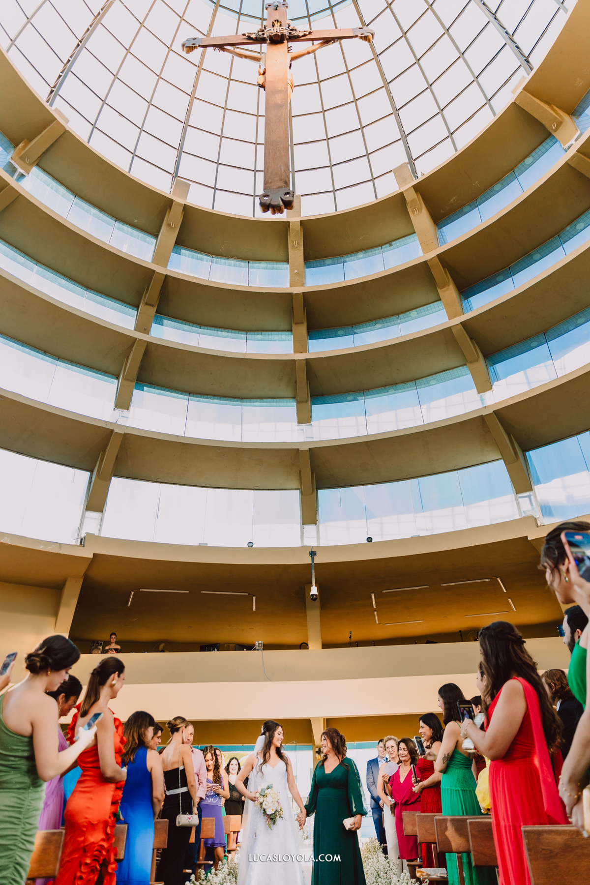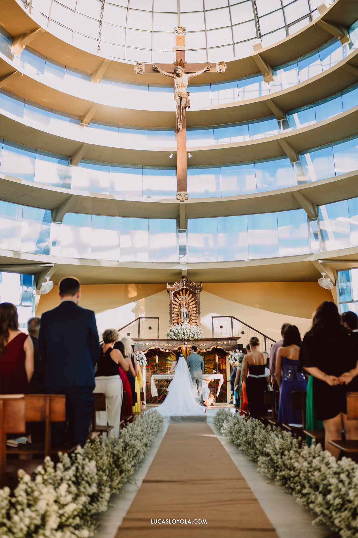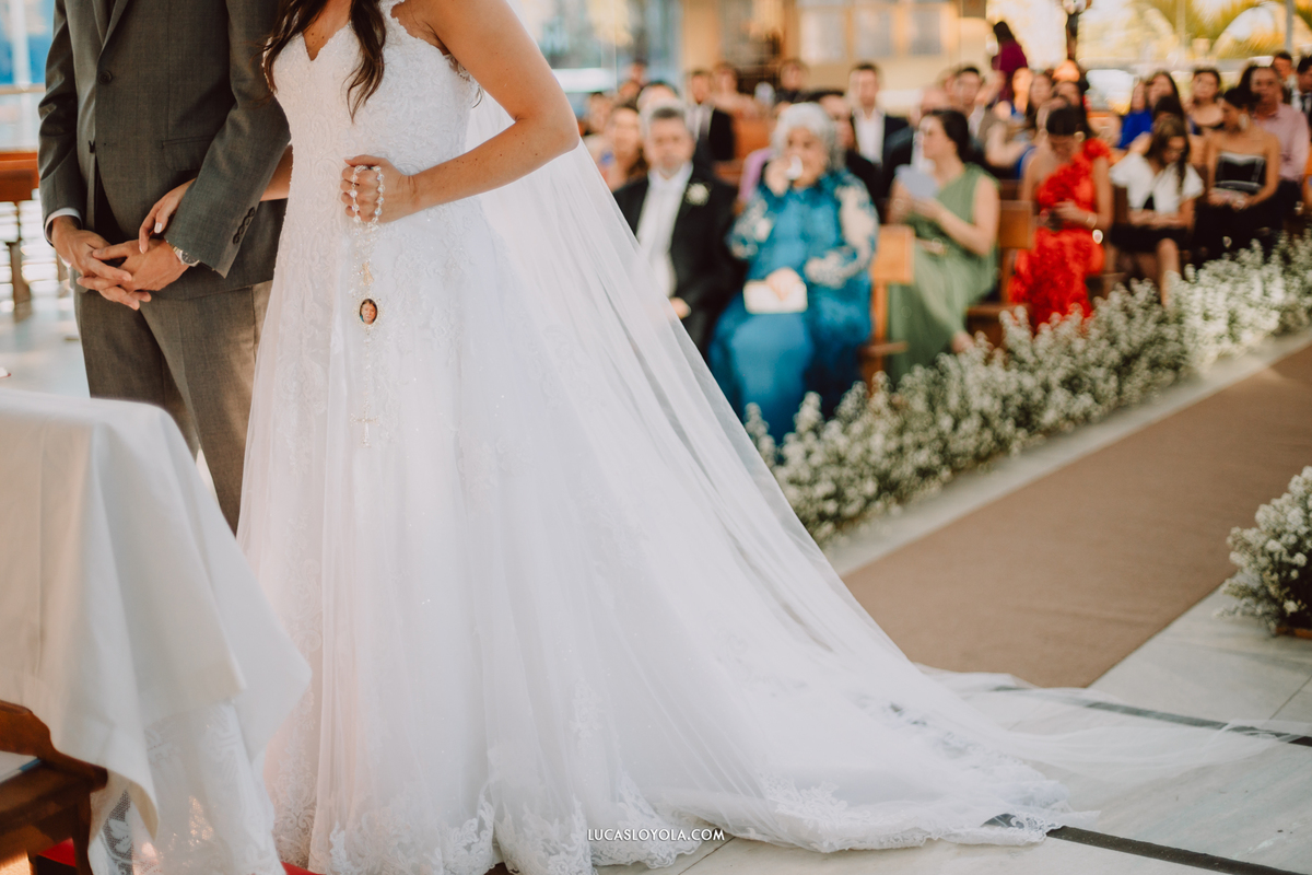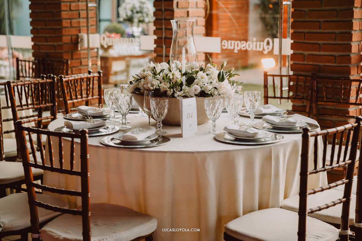 O estilo escolhido pelo casal foi clássico, com um toque de elegância que combina perfeitamente com eles. Mas aqui está o detalhe especial que fez esse casamento único: a cerimônia aconteceu em uma igreja redonda, toda cercada de vidros. A luz do dia criou uma atmosfera mágica.